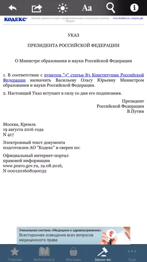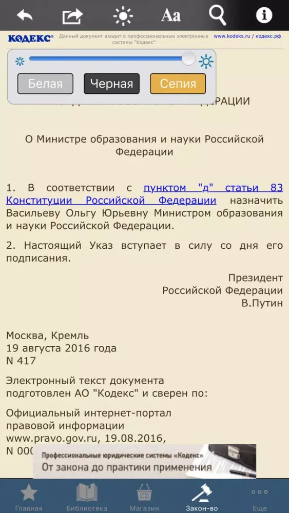 В данном приложении собраны все Кодексы, основные Федеральные Законы РФ и другие нормативно-правовые акты, а также Комментарии к Кодексам и Законам, учитывающие новейшие изменения и дополнения. Приложение использует наиболее актуальную и полную информацию, предоставленную ведущими специалистами в области права и непрерывно обновляется, что имеет первостепенное значение в работе с юридической литературой.
