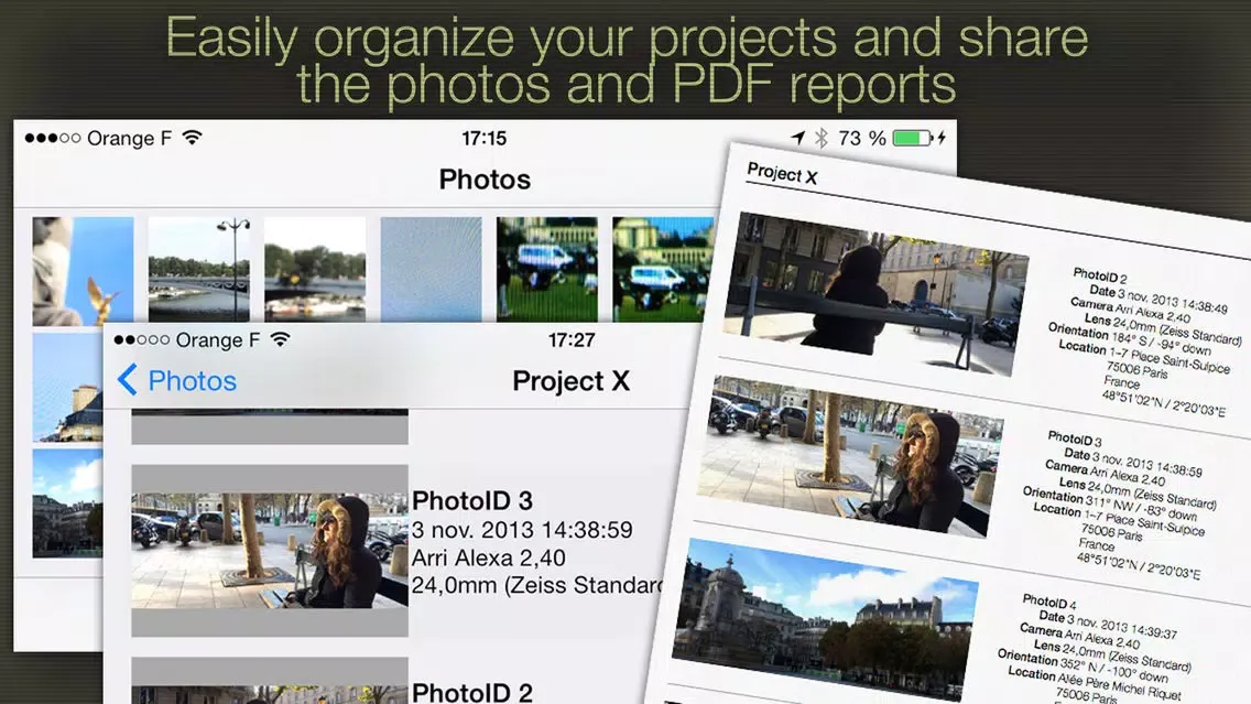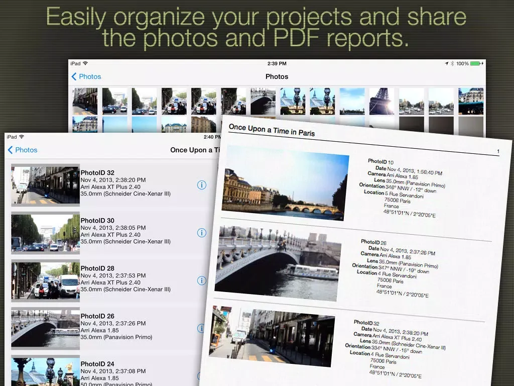 Sharing your shots is made simple by using the latest iOS technologies and devices. Send to other via AirDrop, iMessage, Email, Facebook, and Twitter, or generate a beautifully formatted PDF with full meta data.