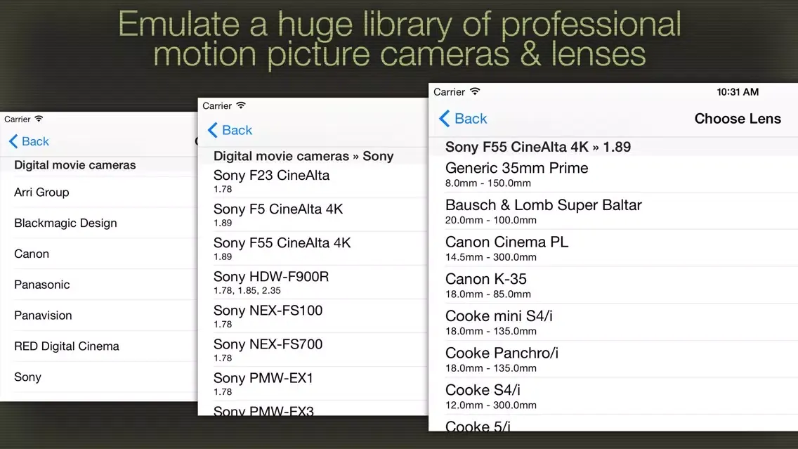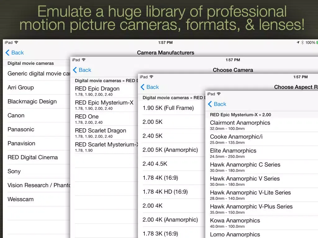 ● Emulate the aspect ratio and field of view of over 45 professional digital and film motion picture cameras, including the latest cameras from ARRI, Panavision, Phantom, RED, Sony, and many others.
