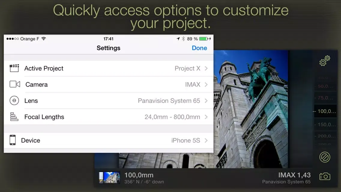 Quickly and easily visualize shot framing for a wide variety of cameras and lenses without the need to haul very expensive equipment on scouts. Because it has been designed for both iPhone and iPad, finding and capturing your shot progression has never been better.