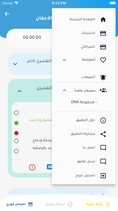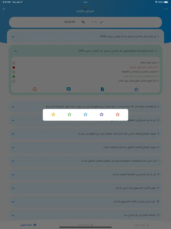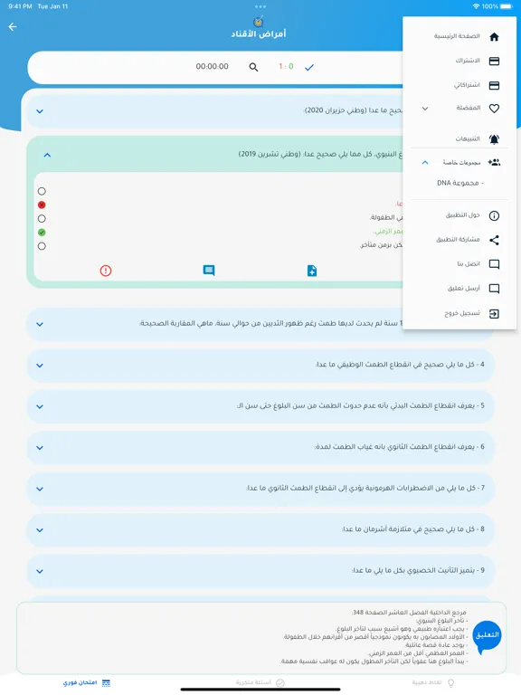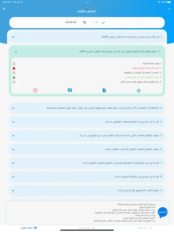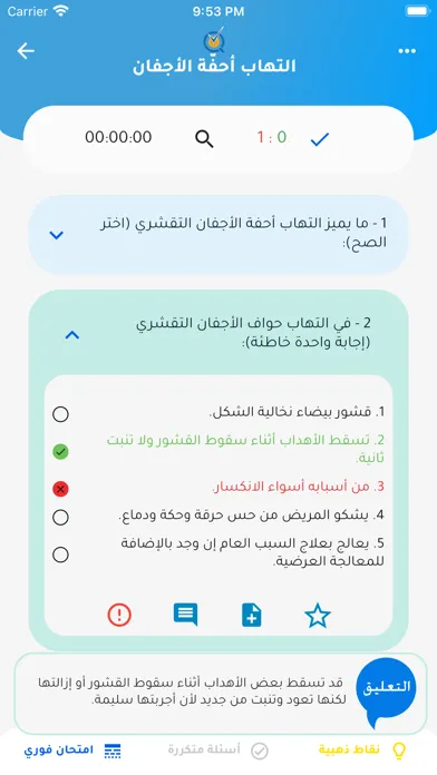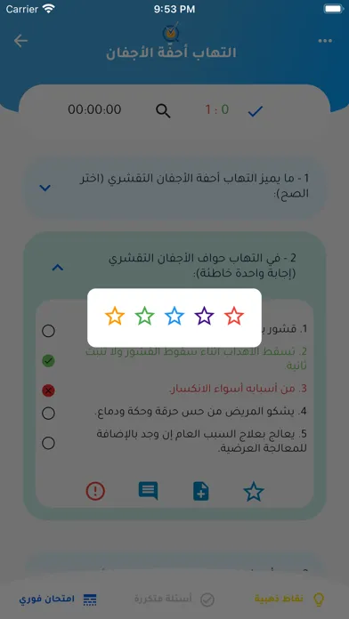 يمكن الاطلاع على الاختبارت عند الانتهاء والتحقق من الاجابات، كما يمكن أسئلة معينة إلى المفضلة.