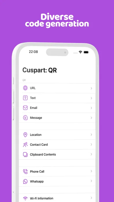 Easily create QR codes for location, contact cards, clipboard content, phone calls, URLs, text, emails, messages, Wi-Fi details, events, WhatsApp contacts, and social media profiles.