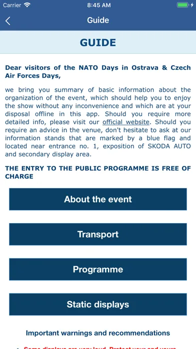 Keep an actual program always at hand, when visiting NATO Days. It shows changes in real time thanks to connection to the display management system. You can also read more information about each display.