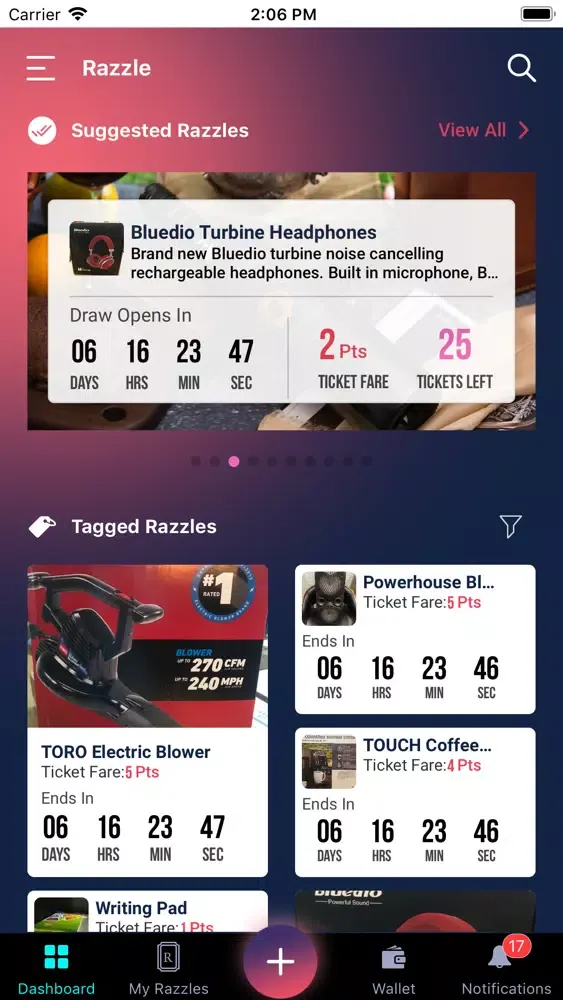 Razzle enables users to create exciting raffles, lotteries, auctions and more. Through the platform, users are able to market to a much larger audience than they previously could - bringing in more exposure and revenue. Browse Razzle and get lucky and win great new products for a fraction of their cost.