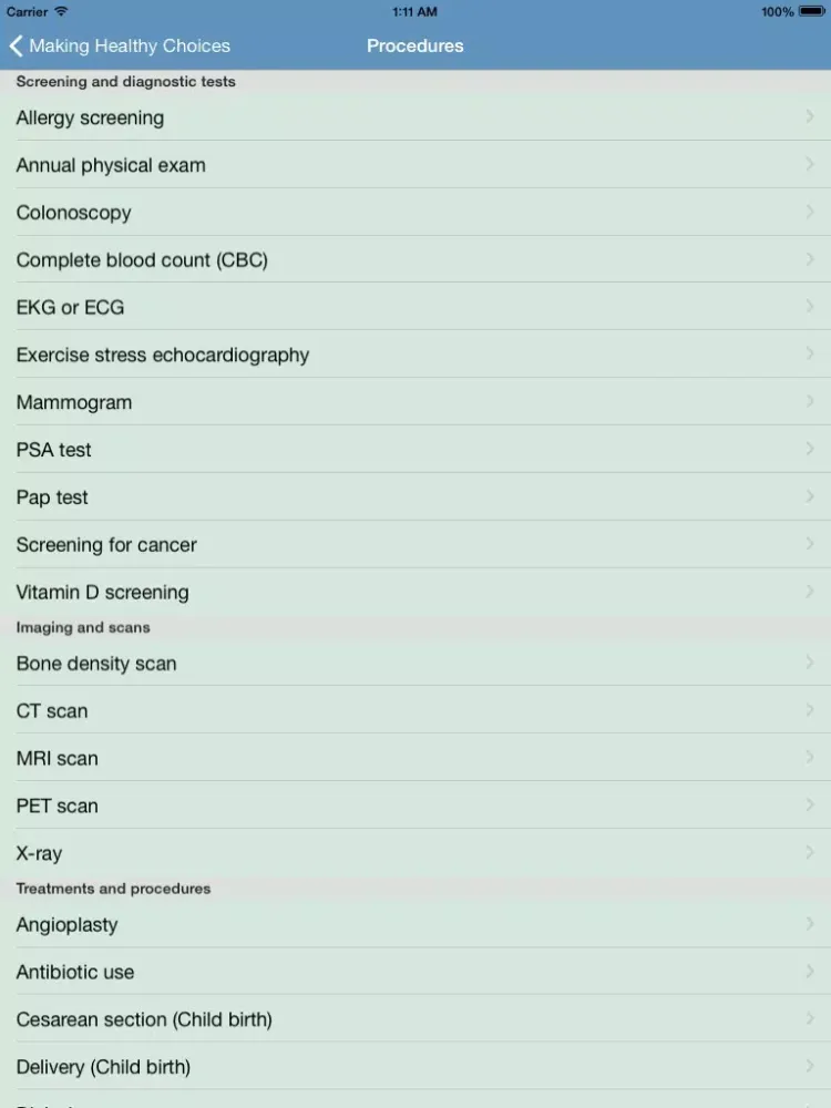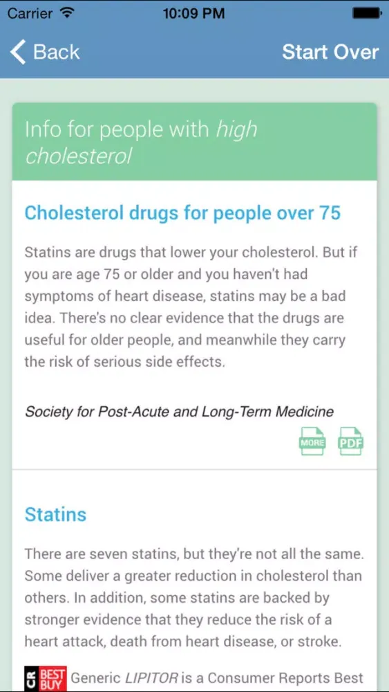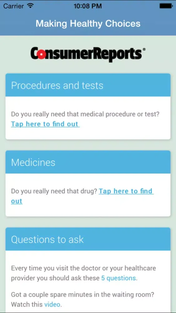 The Making Healthy Choices app empowers consumers to find answers to those questions, and to start a conversation with doctors. The app draws on a large repository of evidence-based guidelines for common medical procedures, tests, and drugs, to give you authoritative answers tailored to your medical conditions and your prescriptions.