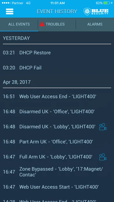 With Blue Security smartphone application you can Arm/Disarm your system, receive intruder alarms together with event images and view live video for visual verification of alarms, take live video images, activate your home automation devices and more.
