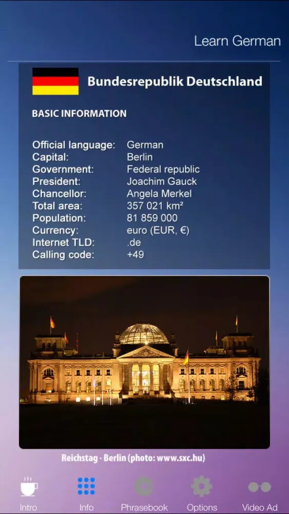 Learn German Plus (Language Learning Audio Phrasebook and Dictionary Offline App for Beginners) - contains questions, answers, words and phrases, which allow users to communicate in standard situations associated with travel and living abroad and may be used as language basics aid.