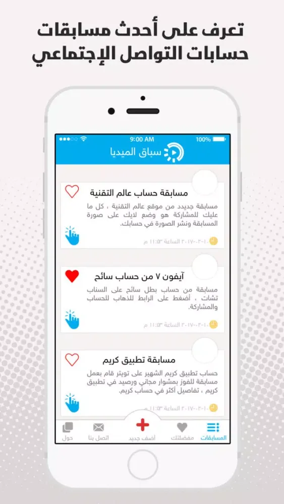 من منا لا يحب المشاركة في المسابقات.. خصوصاً مسابقات حسابات التواصل الإجتماعي.. الآن ومع تطبيق "سباق الميديا" يمكنك معرفة أحدث مسابقات حسابات التواصل الإجتماعي مع نبذة عن كل مسابقة والمشاركة فيها بكل سهولة وسرعة. كل ما عليك هو الدخول للتطبيق لتجد أحدث المسابقات ، كما يمكنك تفعيل التنبيهات لتطبيق "سباق الميديا" حتى يأتيك إشعار فور إضافتنا لمسابقات جديدة.