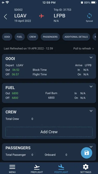 SD Crew gives flight personnel timely access to automated data coming from Satcom Direct’s FlightDeck Freedom service. SD Crew allows pilots to view, modify, and log Out, Off, On, and In (OOOI) times, fuel levels, and crew details. Data modified and logged in the SD Crew app is stored in the SD PostFlight system where it can be verified and sent to maintenance providers, engine manufacturers, and scheduling systems.