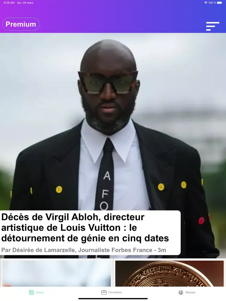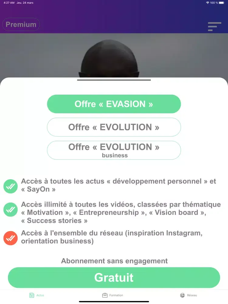 > Souscrire à un abonnement mensuel sans engagement pour utiliser toutes les fonctionnalités de l'application (Actus+Formation+Réseau) et créer des connexions qui te serviront tant sur le plan professionnel que sur le plan personnel.