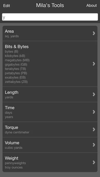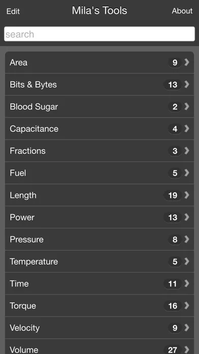 Mila’s Tools is an elegant, no frills, fast, easy to use, unit conversion calculator. Included converters: Area, Bits & Bytes, Capacitance, Fraction, Fuel, Length, Liquid(Volume), Numbers, Pressure, Temperature, Time, Torque, Velocity and Weight. All built exclusively for the Apple iPhone.