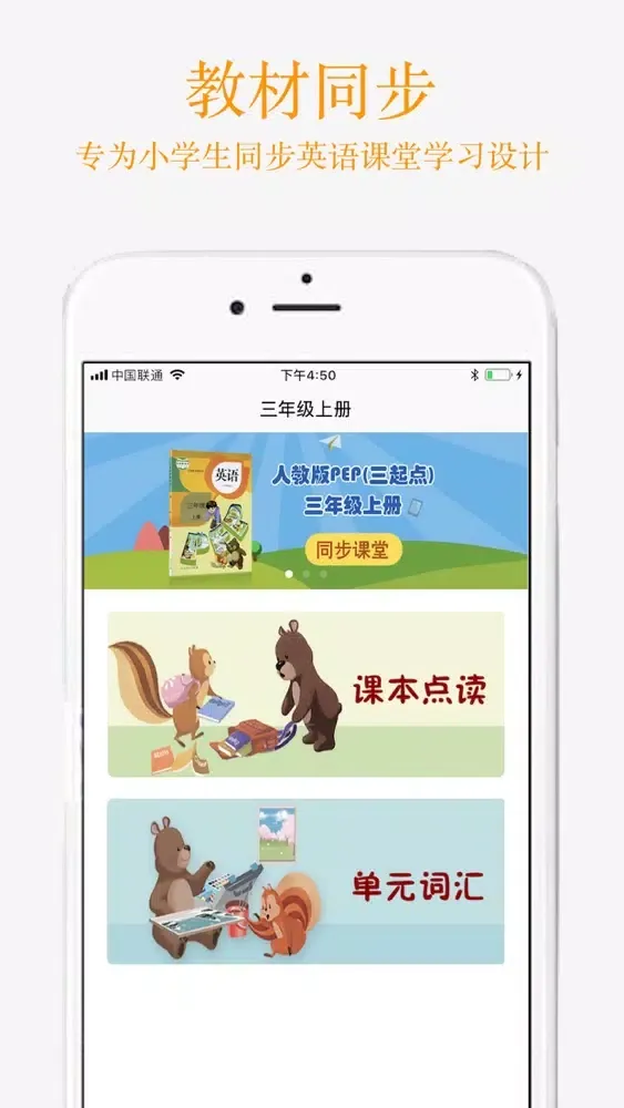 专门为小学生量身打造的英语课堂同步学习软件,包含课文点读、中文翻译、单词学习,每单元还提供了习题可供练习。将大书包装入小手机,一套可随身携带的智能电子课本。
