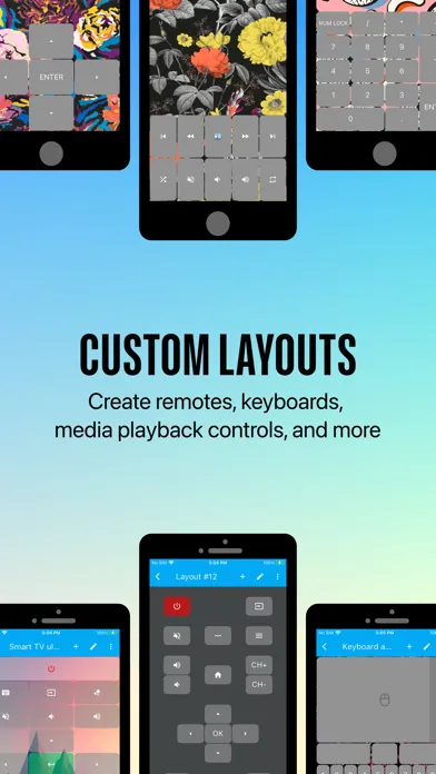 The app supports creating custom layouts to allow you to create your own smart TV remote, presentation remote, game controller, tablet remote, remote control for PC, or other Bluetooth interface. Custom layouts can be exported and imported from the app for easy sharing and backups.