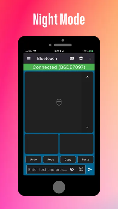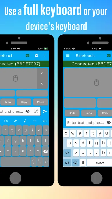 The app offers a full-featured keyboard that includes function keys and arrow keys. Your device's system keyboard can also be used instead of the app's custom keyboard in order to use familiar features such as swipe gestures, text autocompletion, and speech-to-text input. The app supports scanning QR codes or barcodes to send the scanned data to a connected device. Text can also be copied and pasted directly into the app to send. The keyboard layout of the app's custom keyboard can be changed to support different languages.