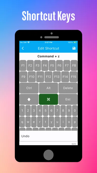 The app supports creating shortcut keys that can send up to six different keyboard keys simultaneously. For example, you could create a shortcut key that sends the "ctrl", "alt", and "delete" keys at the same time to a connected PC.