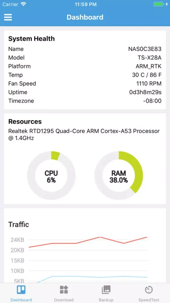 A tool for monitoring and managing your QNAP NAS server. Main functional modules include Dashboard, Download Station, Photos/Videos Backup and SMB Speed Test.