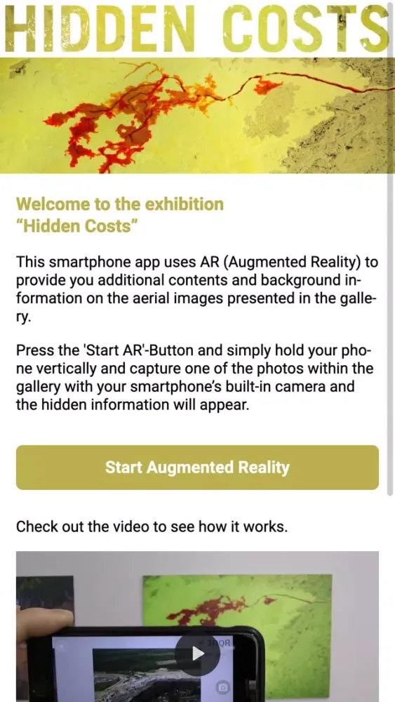 The “Hidden Costs” app is a companion for any exhibition visitor that is curious to know more about the images they see. The app uses AR (Augmented Reality) technology to let hidden information come to light and provide additional information for each image in the exhibition. The content is only available in the exhibition gallery.