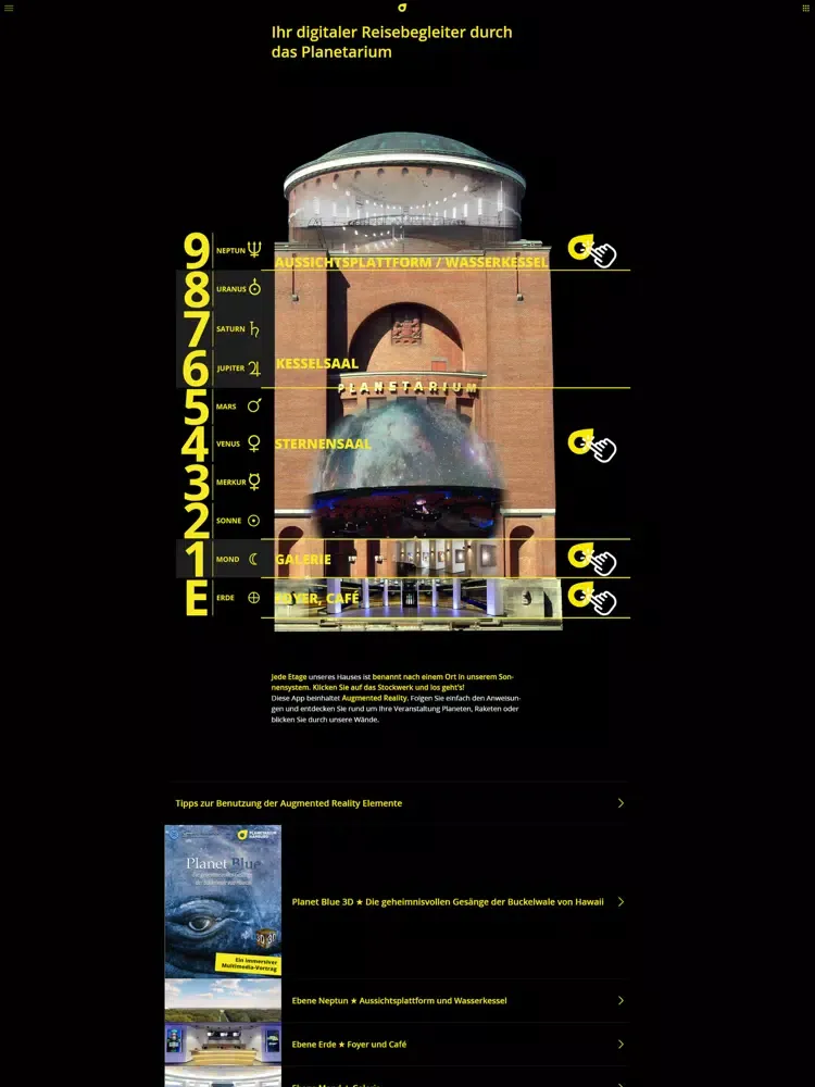 The Planetarium Hamburg not only offers fulldome shows, concerts, lectures and exhibitions. There is also a lot to discover in the building itself - a former water tower with a unique view. The PLANETARIUM HAMBURG app guides you through our tower, level by level.