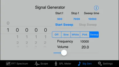 -The Signal Generator provides a sine wave output up to 20,000Hz in 1 Hz steps, along with noise generators for white and pink noise. Sweep generation with In App Purchase