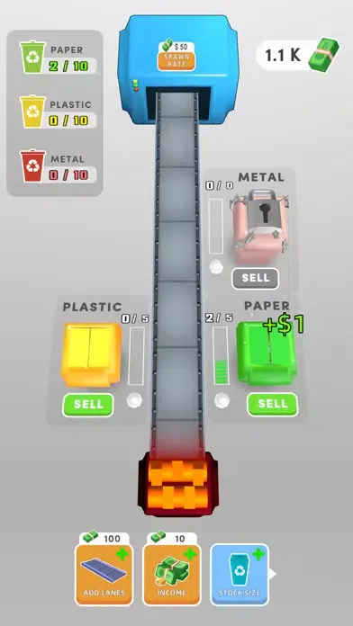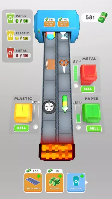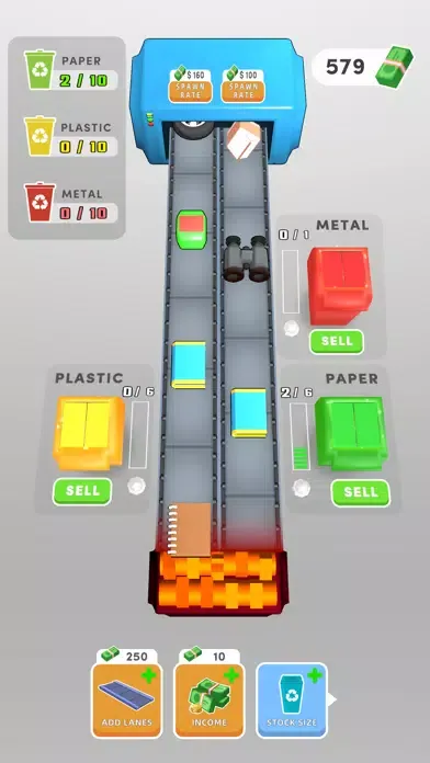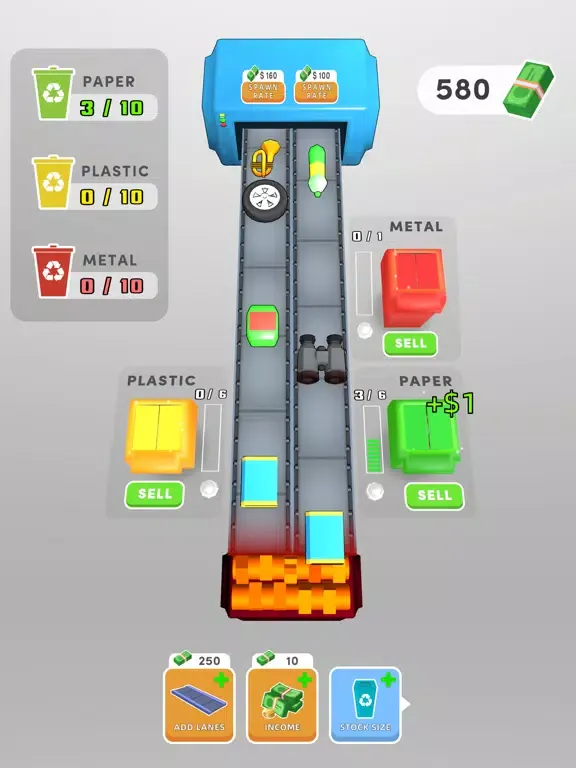 Direct the materials coming through the conveyor to the correct boxes and earn game coins by recycling them.