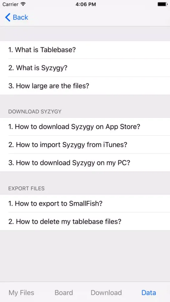 Syzygy 6-men endgames require significant system resources to run. It is recommended only a single 6-men endgame is installed (e.g. rook endgame). The SmallFish app might crash if you have too many 6-pieces installed (not enough memory). Your device should be iPhone 6/iPad 3 or newer, with at least 2GB RAM.