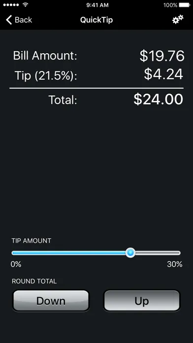 QuickTip provides a fast and convenient way to calculate the gratuity for any bill. Using large text and simple controls, QuickTip is an easy and fun way to figure out tips. An intuitive slider allows you to quickly adjust the tip percentage while seeing the tip and total amounts update in real-time. If you prefer to use buttons, you can set your most frequent tip percentages in QuickTip's settings for easy access. Once you have settled on the tip amount, you can easily round the total bill or the tip amount up or down with the tap of a button. With QuickTip, calculating any tip is only a touch away.