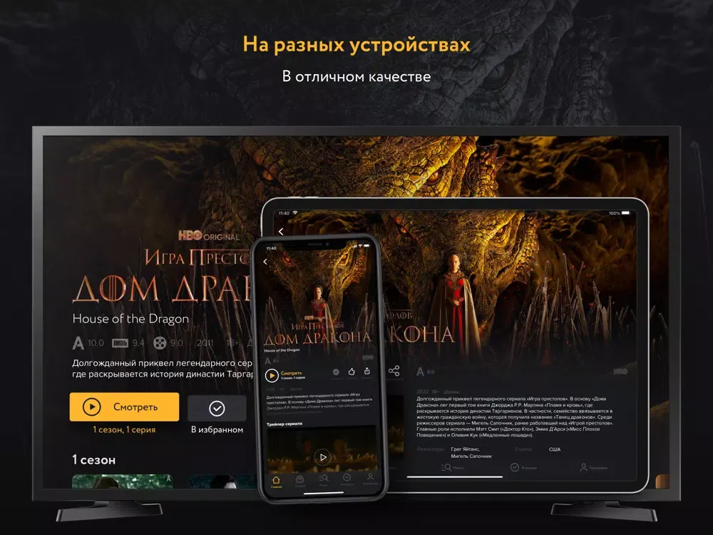 Вас ждут новые проекты и вся библиотека кино и сериалов HBO, хиты ведущих телеканалов и студий мира (FOX, Showtime, Starz, BBC, CBS, Sony Pictures). Новые российские сериалы. Коллекция художественных и документальных фильмов, комедийных кино и сериалов, драм, фантастических фильмов, концертов и стендап-шоу.