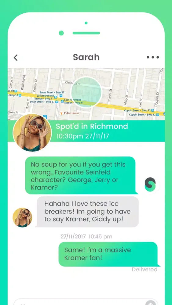 • Icebreakers – No matter how the connection begins, whether it’s via being Spot’d, mutually matching or a SuperSpot, once you're connected there is no more awkward silence thinking of opening lines to start the conversation. Spota sends the first question to make sure the conversation flows.