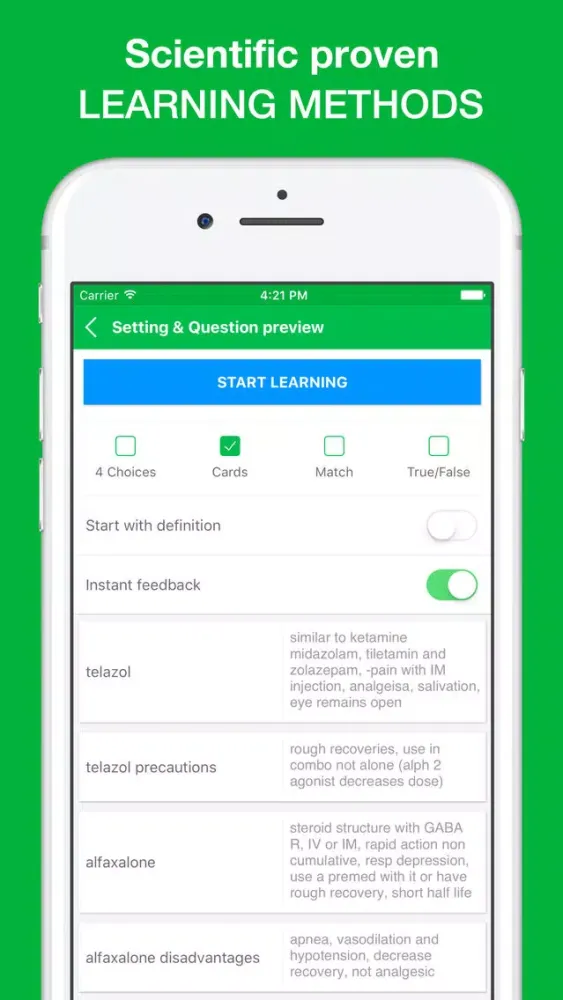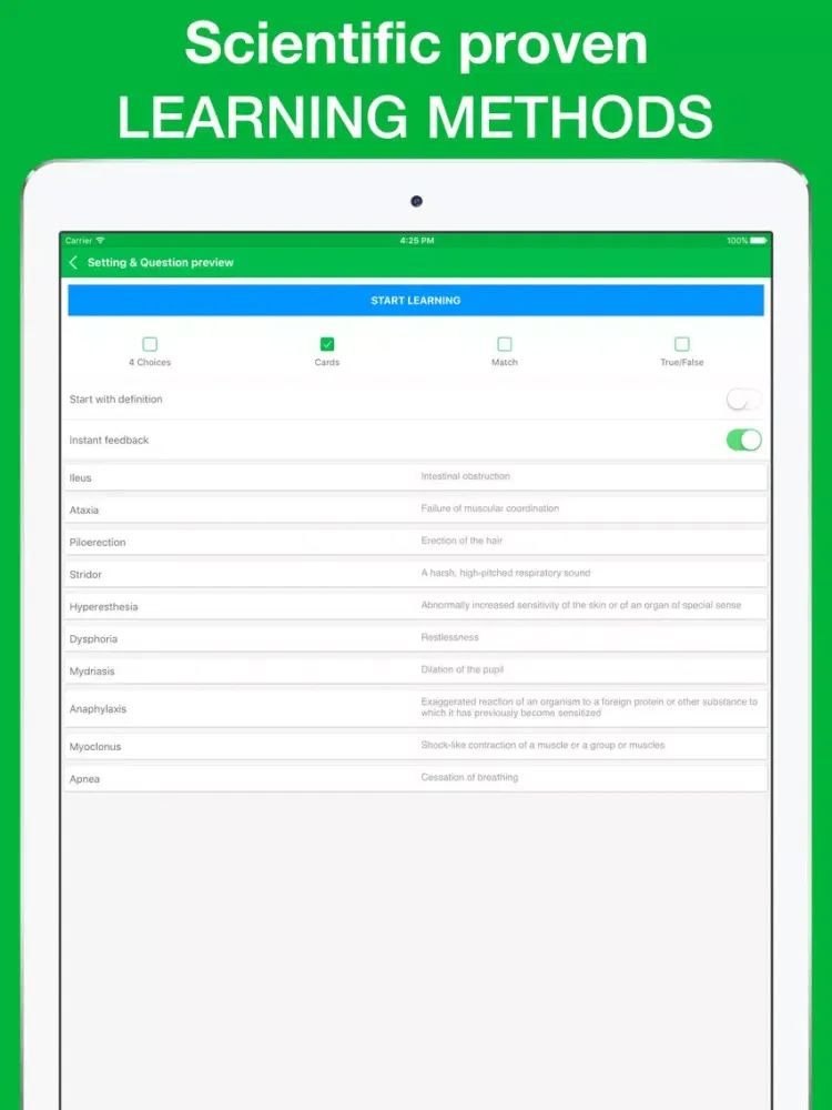 +) MASTER each study set effortlessly by many scientific proven methods: Multiple Choice, True/False, Matching, etc