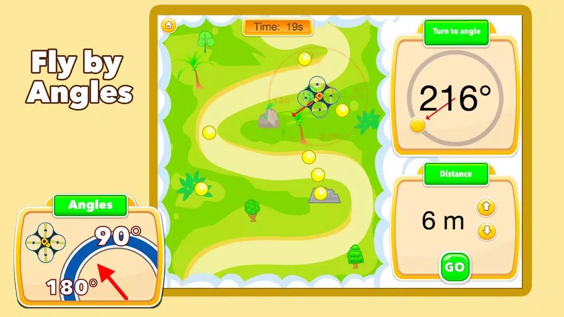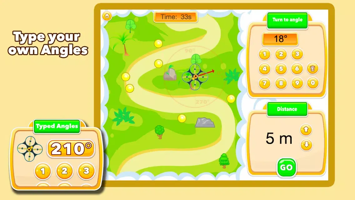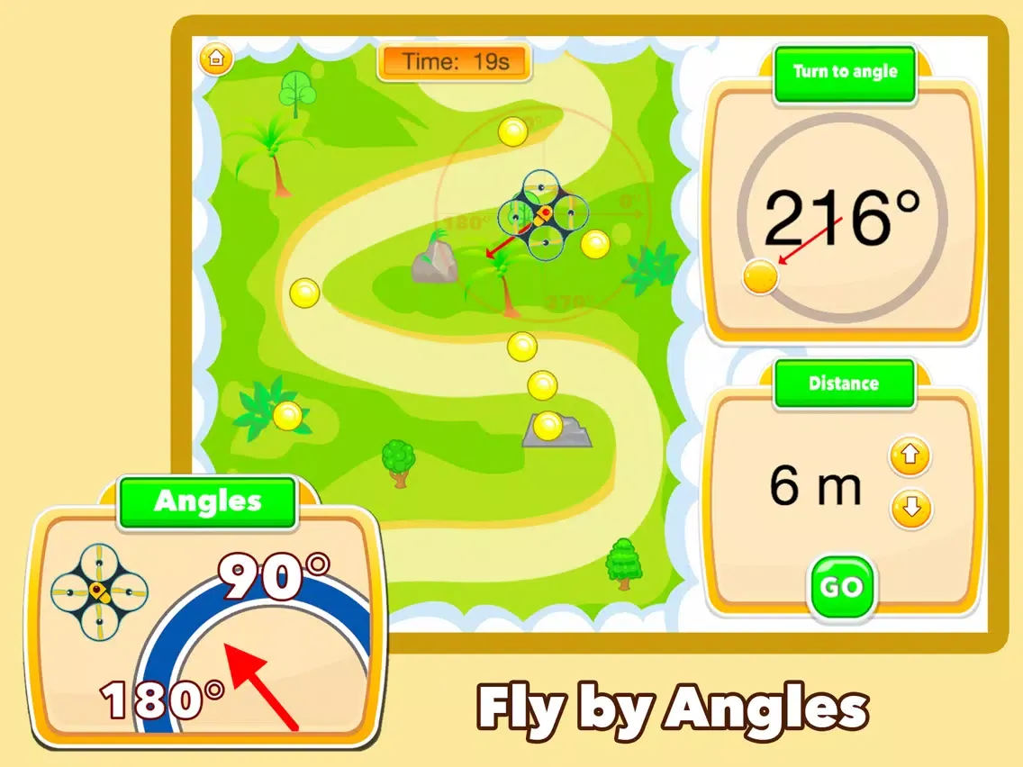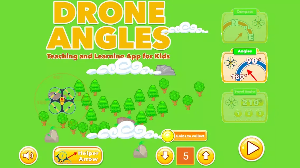 In Angle Drones primary aged children (6-11) navigate using Angles or Compass points to fly around the environment as quickly as possible collecting all the coins. They can start out using simple compass directions and then move up to arrow-guided angles before moving up to estimating and typing in their own angles.