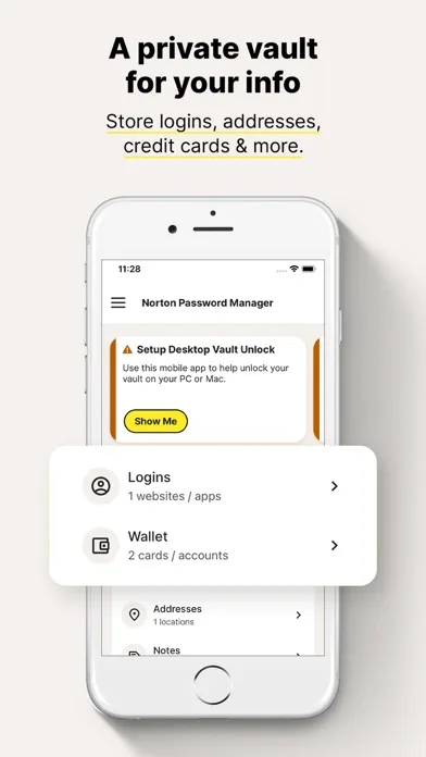 ³ Vault Password Reset can only be initiated on an iOS smartphone. To work, your smartphone must have the Norton Password Manager mobile app installed, set up, and connected to your Norton account, plus the Biometric Authentication (fingerprint, or Touch ID/Face ID) activated, beforehand.