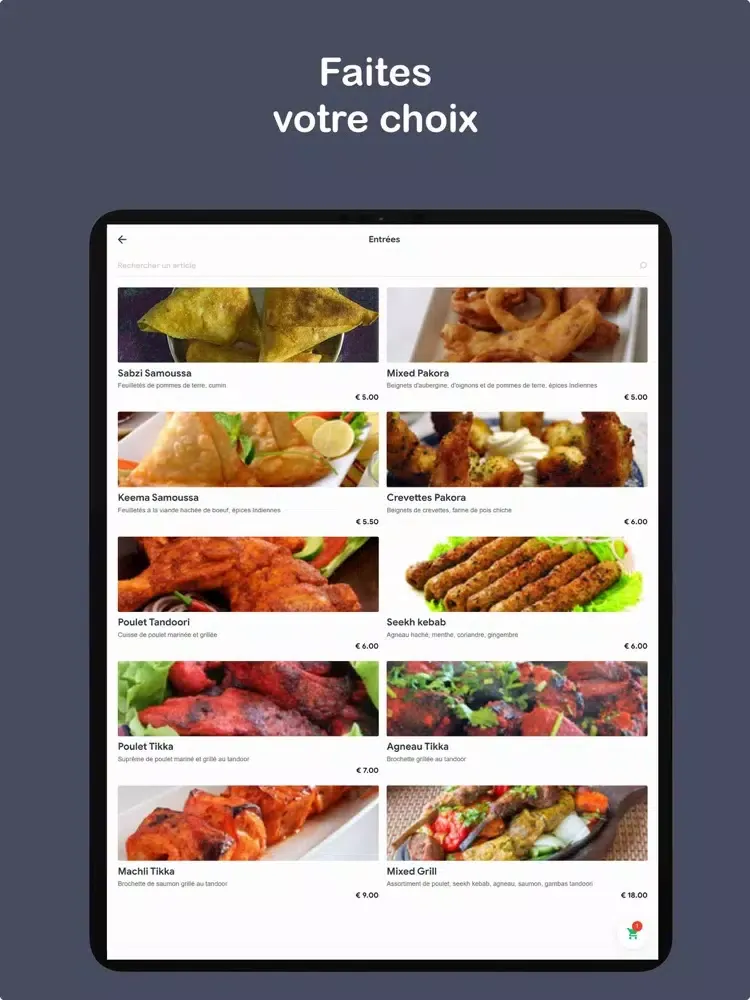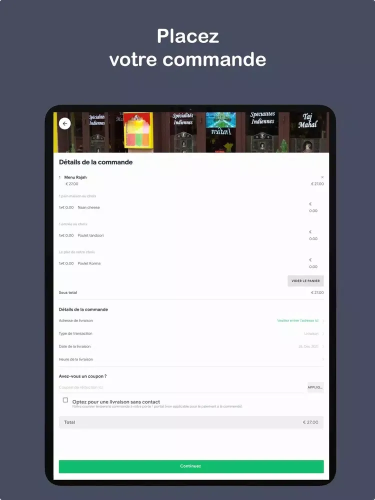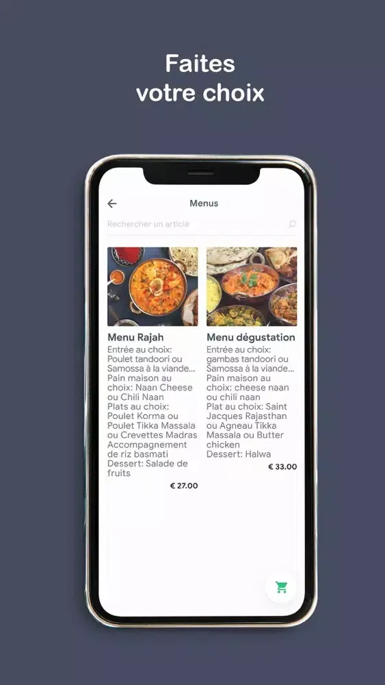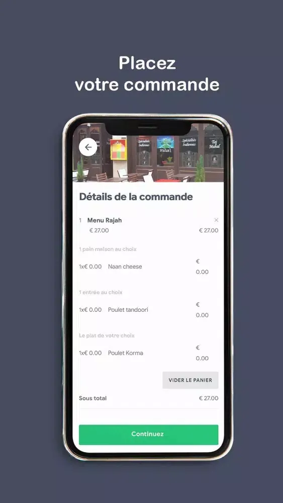 Composez votre menu sur notre Application et Commandez vos plats préférés de la Taj Mahal Chalon sur Saône restaurants indien, choisissez votre mode de paiement, passez commande et vous n'avez plus qu'à patienter.