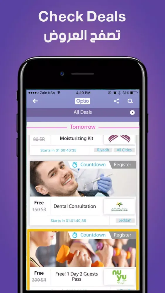 العروض في تطبيق أوبتيو ليست مقدمة أو برعاية شركة جوجل أو شركة أبل (Apple, Inc.). تفقد شروط وأحكام المشاركة بالعروض على الرابط التالي: http://optiodeals.com/rules/ عند مشاركتك بتطبيق أوبتيو، انت تؤكد أنك قمت بالقراءة والموافقة على قوانين وشروط وأحكام وسياسة الخصوصية للتطبيق