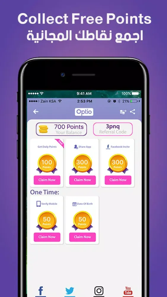 اجمع نقاطك المجانية يوميا من أوبتيو لتحصل على كوبونات وتنافس على جوائز قيمة في فئات مختلفة مثل الالكترونيات، الجوالات، المطاعم، الصحة والجمال وغيرها.