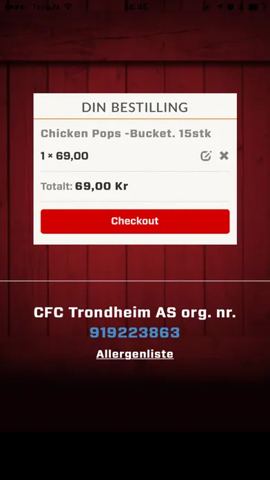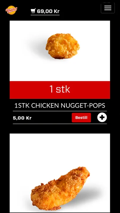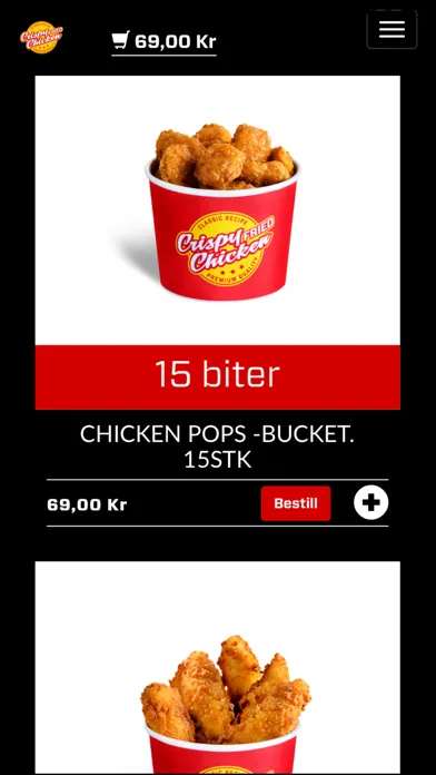 Her kan du bestille mat Crispy Fried Chicken. Maten kan bestilles "snarest" eller til ønsket tid.