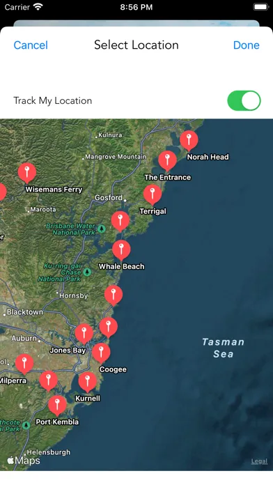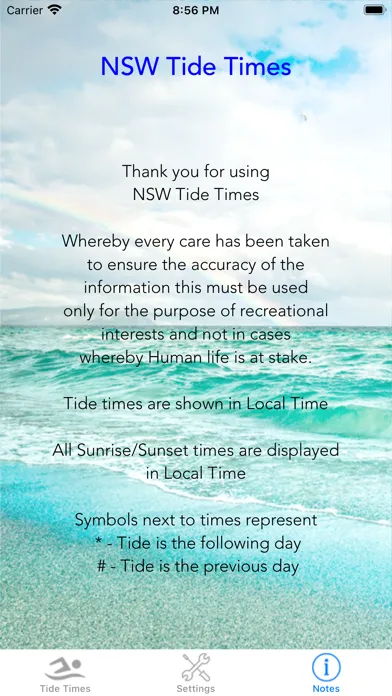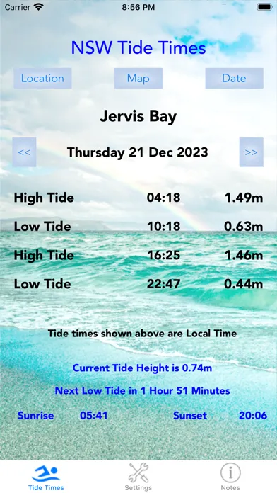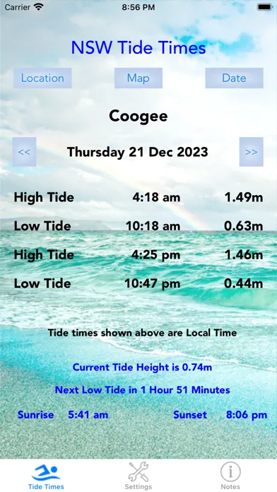 Sydney and NSW are wonderful places to live or holiday. With this application you can track the tidal information for the area as it shows all the low tide, high tide, sunrise and sunset times, for that current day. The tide heights are also displayed, along the actual current tide height for that location. There is a display of the next tide due and how long. You can also select future dates, to make it easier to plan a successful beach, fishing or river trip. No Internet access is required, so even if you are sitting in an area with no coverage, you can still check the tide information. The GPS and maps function does require a data connection though. All coast locations in NSW are covered for Sydney beaches and surrounding NSW ports, including Batemans Bay, Byron Bay, Camden Haven, Cape Hawke Harbour, Clarence River, Coffs Harbour, Jervis Bay, Lake Illawarra, Lake Macquarie, Manning River, Port Kembla, Port Stephens, Shoalhaven River, Gladesville Bridge, Spit Bridge, The Entrance, Wollongong, Wooli River and more.......