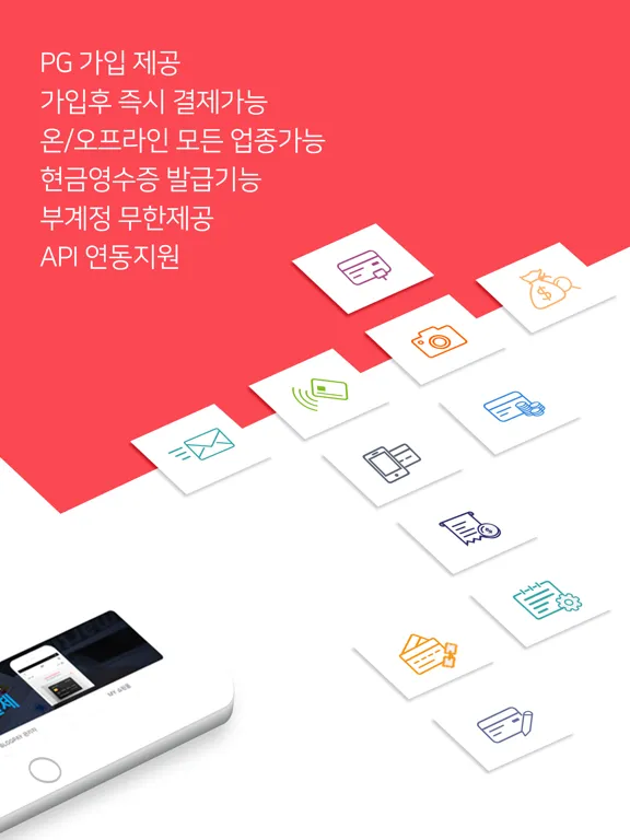 * 이용 가능 API : 카메라결제, 애플페이 결제, QR결제, 수기결제, 현금영수증, 부계정 서비스, PG모듈, 주문서결제, 무통장입금 자동확인 모듈, 원격결제/해외결제, 통계툴, 메시징(문자/카톡발송), 본인인증, 계좌실명인증, 맞춤정산대행 등