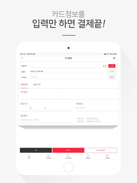 △ 고객의 카드정보를 받아 앱에서 입력 후 결제 승인 (수기 인증/비인증방식 모두 지원)