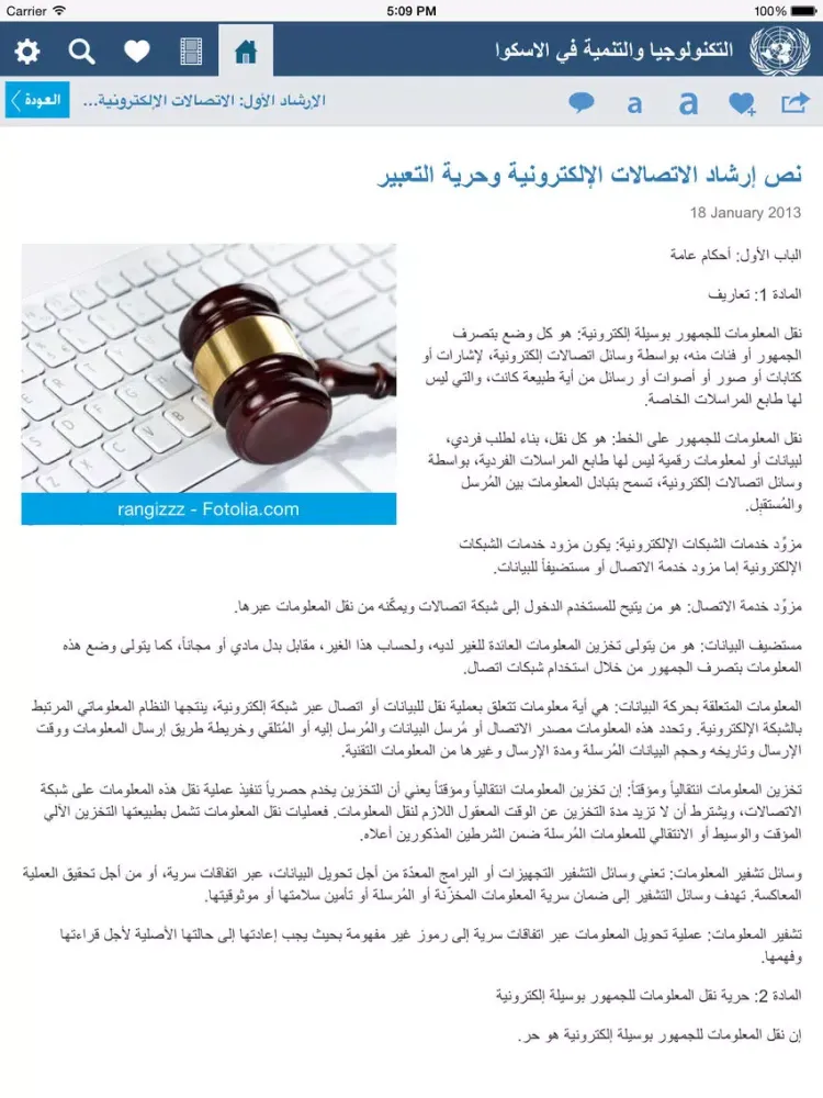 This iPad app provides information on activities by the United Nations Economic and Social Commission for Western Asia (ESCWA) on technology for development as implemented by the Technology for Development Division. Activities are clustered into thematic focus areas that fall within the mandate of ESCWA and internationally agreed goals. Thematic areas covered: profiling the information society in the Arab region, the development and harmonization of cyber legislation for promoting cyber safety, Internet governance, ICT policy for social and economic development, digital Arabic content, the impact of ICT on social and economic development, and research and innovation in science and technology.