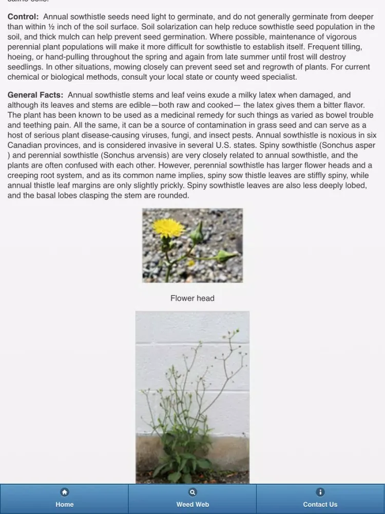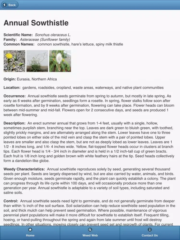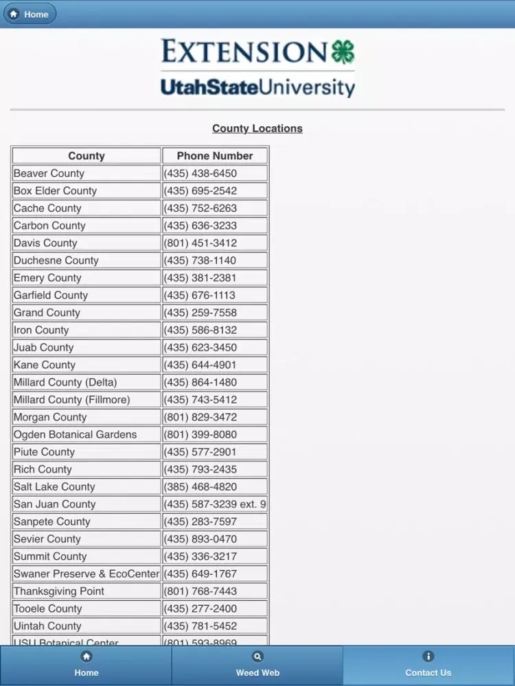 This app is designed to help identify the 50 most common weeds in the home landscape. The 50 weeds are listed in alphabetical order by scientific family names, and within families by scientific generic and specific names. Each weed listings contains full color photos and a description about the weed including location and occurrence. A PDF version and hardcopy of this field guide can be purchased online at extension.usu.edu/weedguides/.