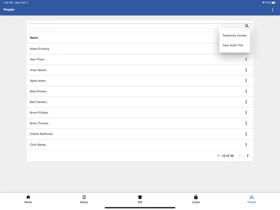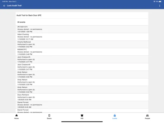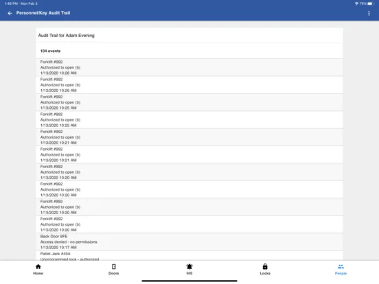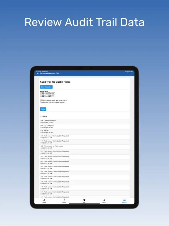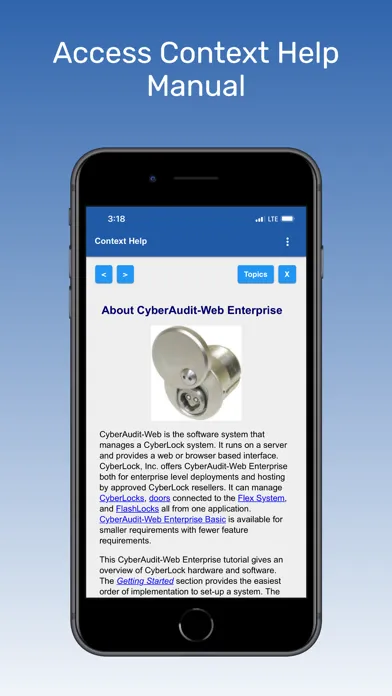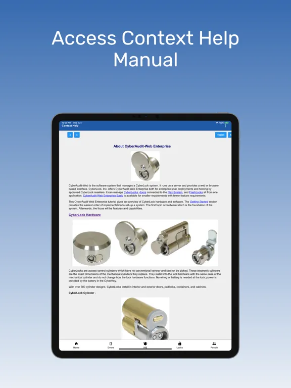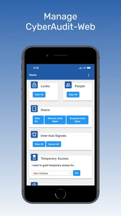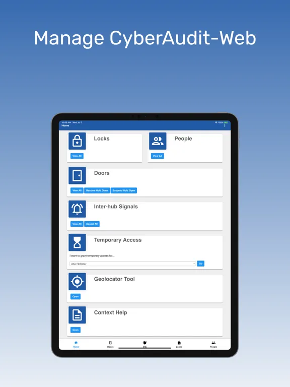 This app is designed to be a window into CyberAudit-Web, with a subset of modules and actions supported. The modules include: Doors, Interhub-Signals, Locks, and People.