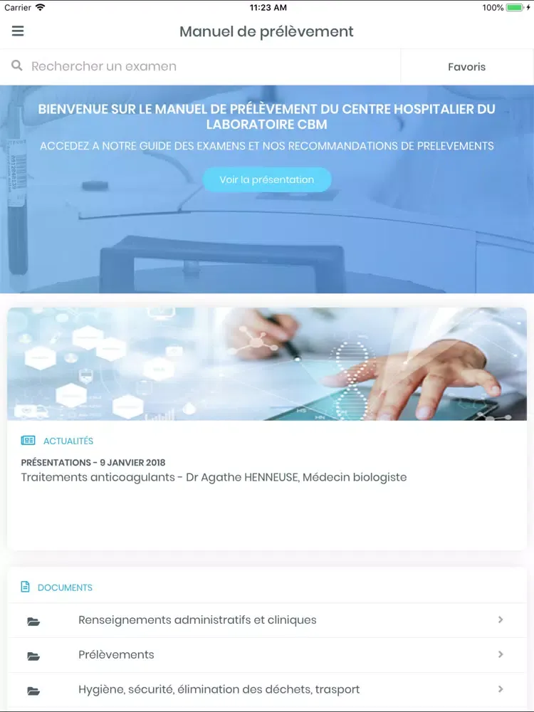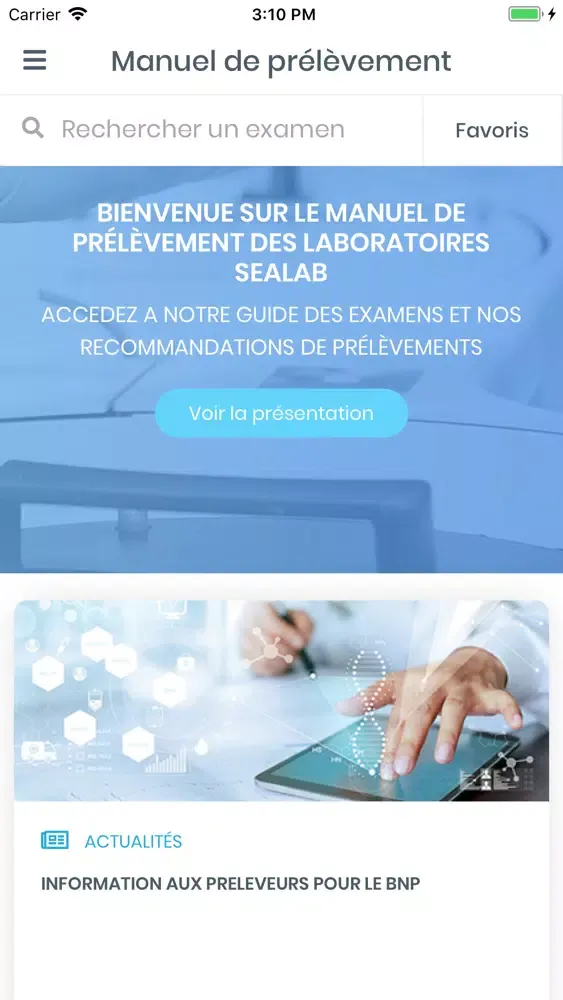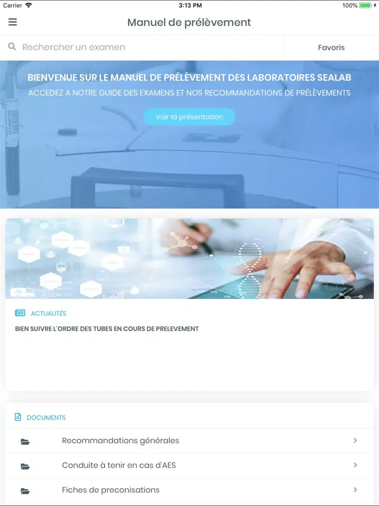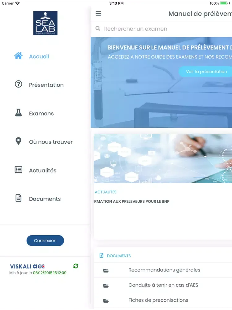SEALAB est une application médicale ayant pour objectif la mise à disposition d'un manuel de prélèvement à l'usage des professionnels de santé (Infirmiers, Biologistes, Médecins).