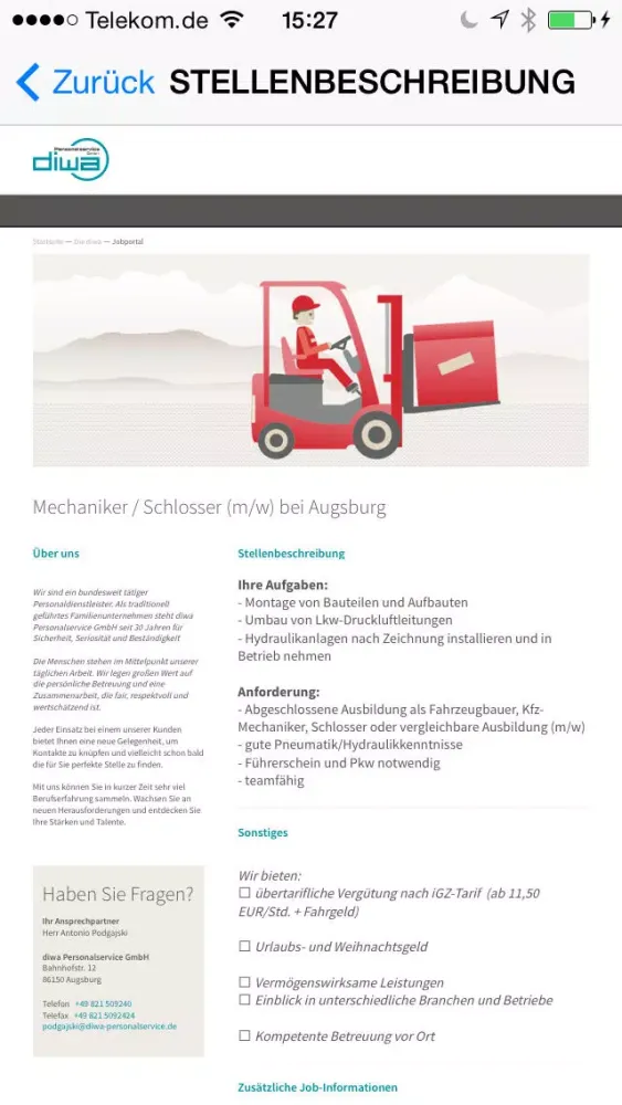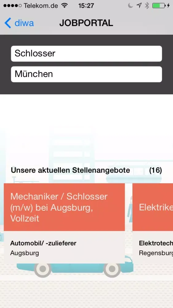 Mit der neuen diwa App ist der richtige Job nur noch einen Klick entfernt. Finden Sie die aktuellsten Jobs, welche Ihren Bedürfnissen entsprechen. Holen Sie sich jetzt die diwa App für Ihr iPhone.