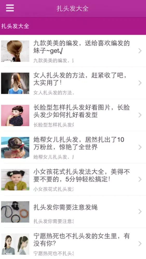 《扎头发大全》是一款关于打理头发的实用生活工具,App中使用丰富多彩的形式展示美发护发、扎头发的方法,有图片、文字、在线视频,手把手一步一步让你瞬间成为美发护发、扎头发的高手。对于爱美的女士来说,是一款超级不错的学习美发护发,扎头发的工具。