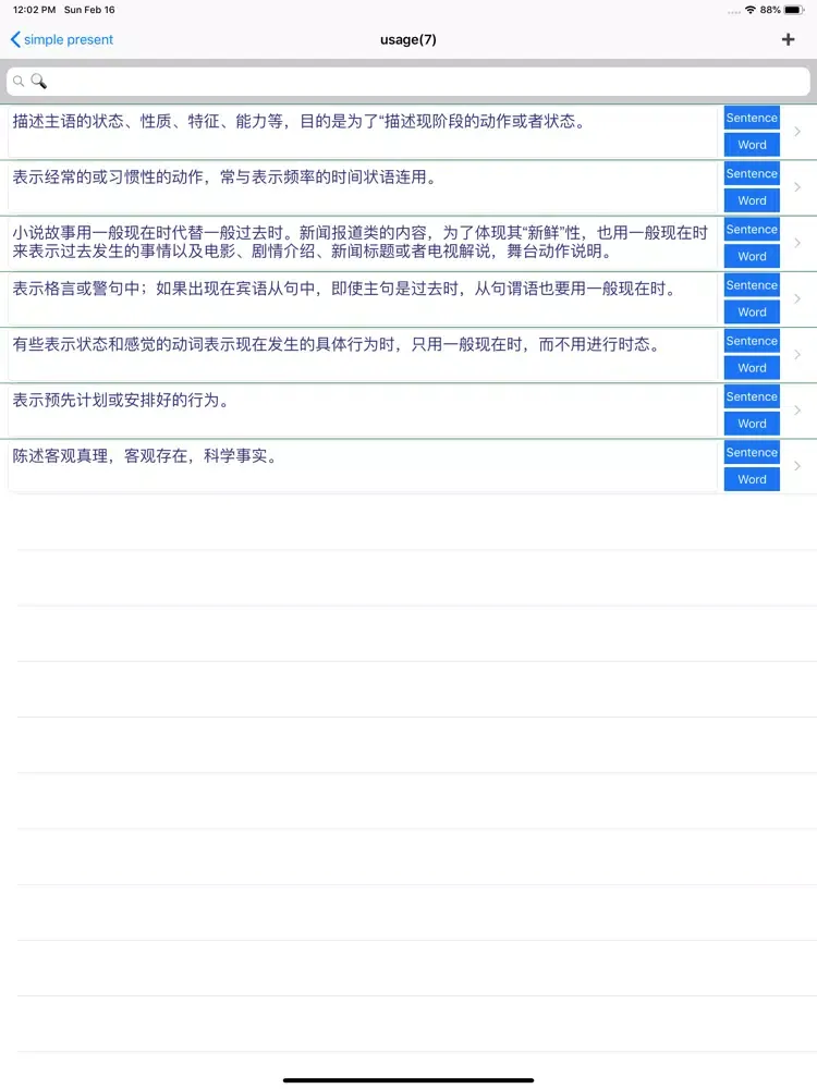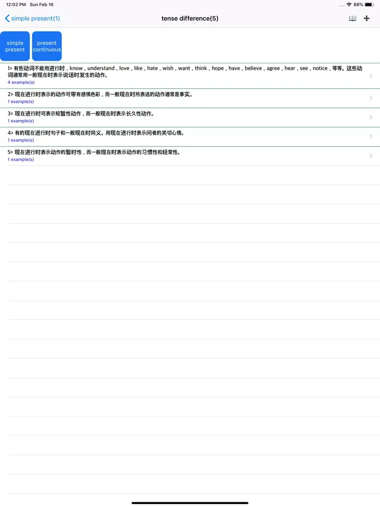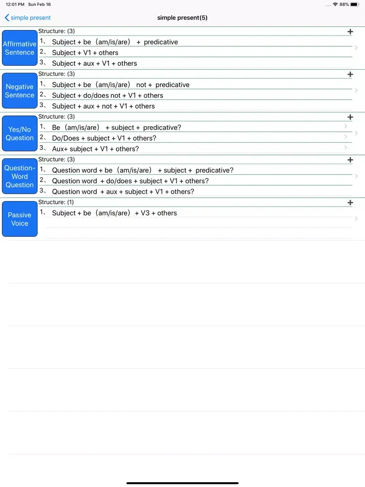 1、Software lists 16 tenses, including simple present, simple past, simple future and simple past future, and other relevant perfect and continuous tenses.