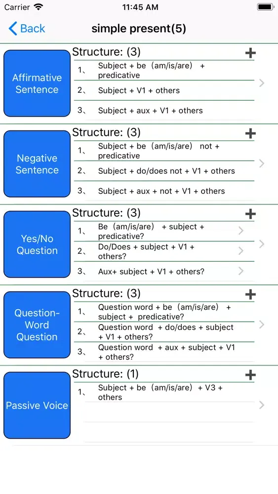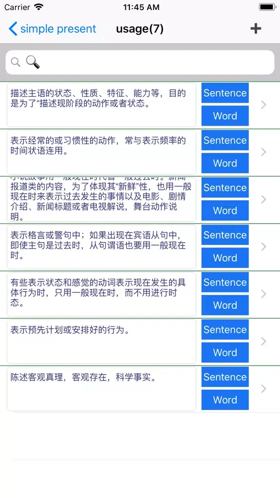 2、Software lists the structure, usage and the differences with other tenses of each tense, and some special usages or comment with abundant examples to enable better understanding and master of grammar points.