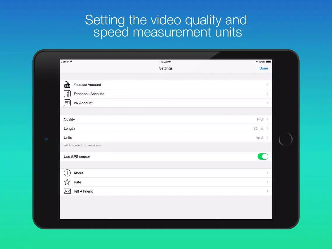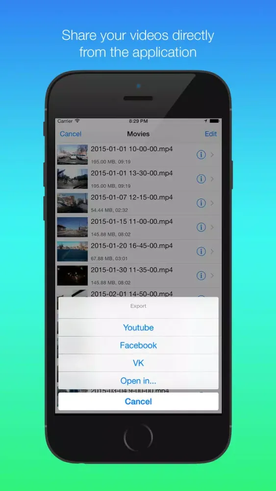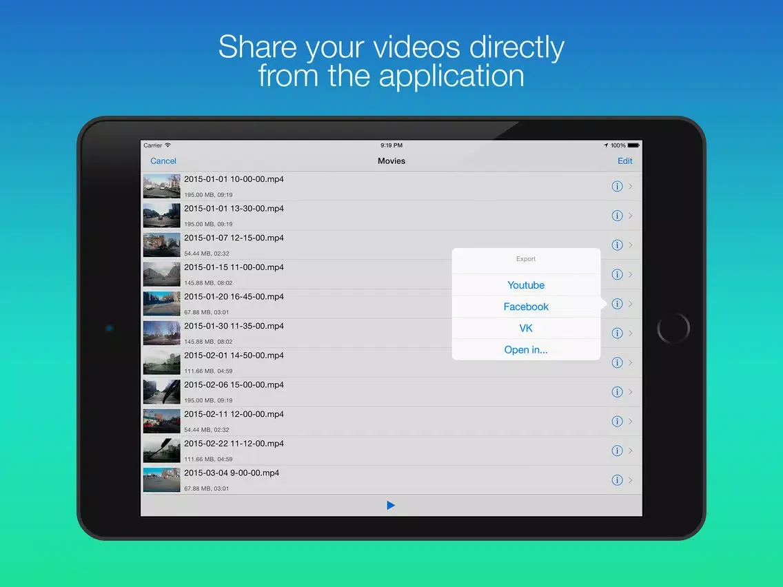 - Share your clips on Youtube, Facebook, VK directly from the application