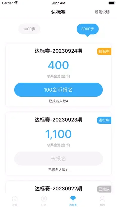 时时更新步数,系统自动实现时时排行。每日前10名步数最多的用户将自动获得排行奖励的金币