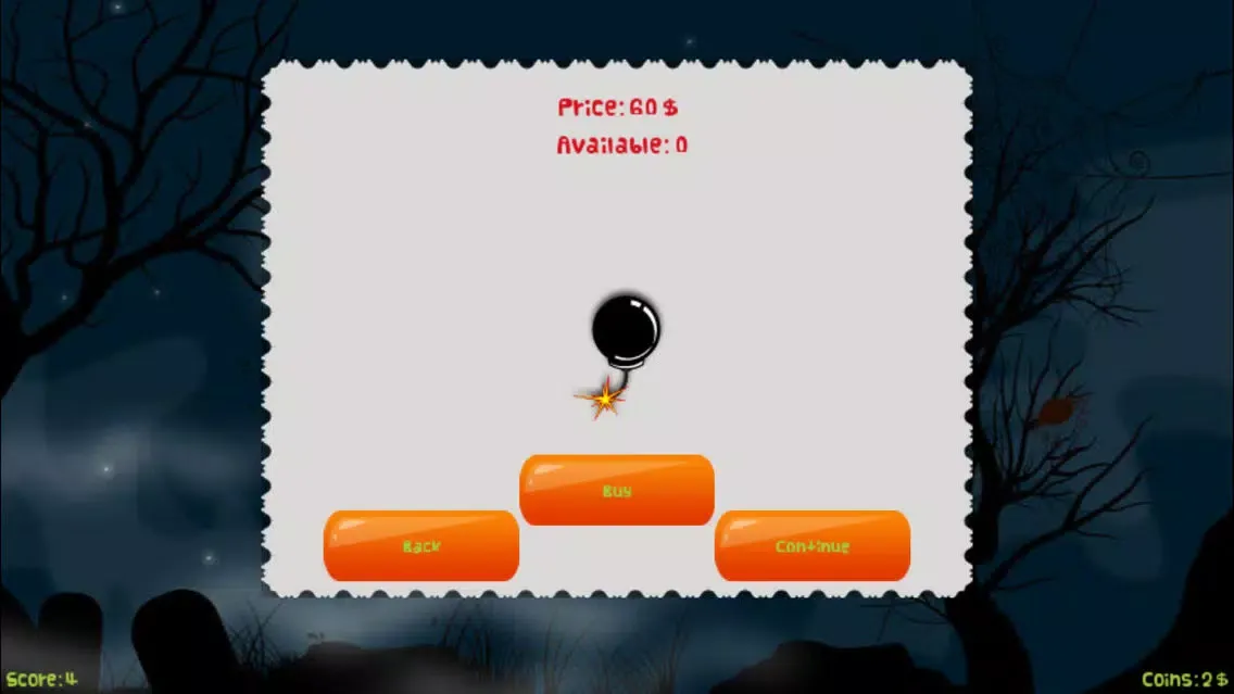 There is a store in which you can buy bomb, which on clicking will destroy all the pumpkin on the screen. There is a gift box which will give surprise elements like few bombs or life or coins. There is a life option also on buying this you can continue the game with the previous score.