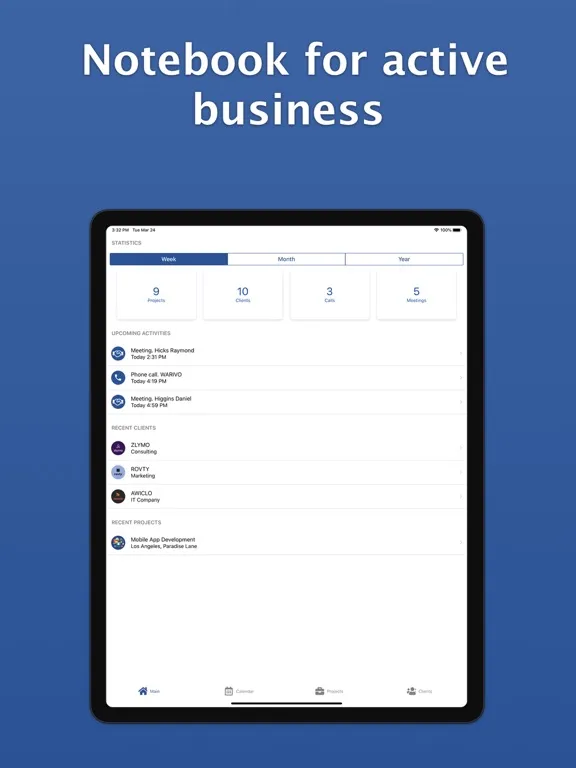 WorkNote - CRM for active sales. Simple and intuitive application to work with clients and projects. It helps businessmen to organise and coordinate their work with projects and customers.